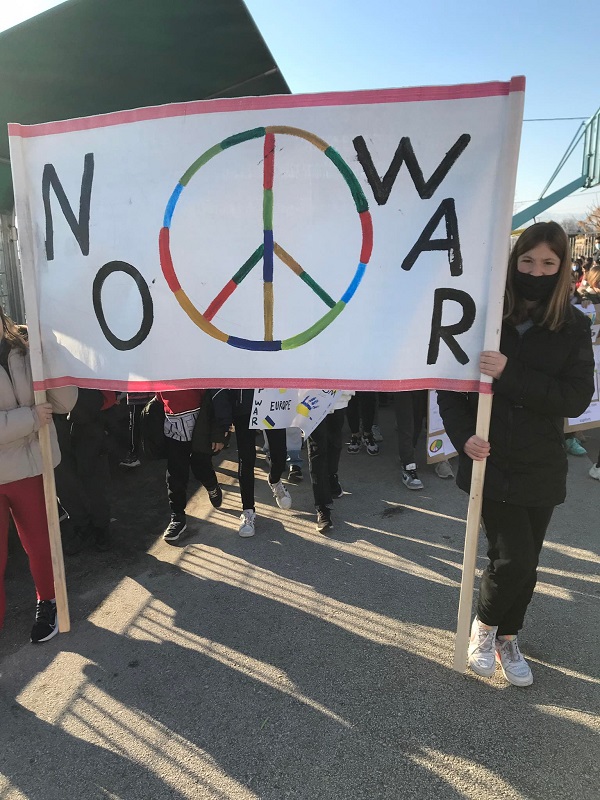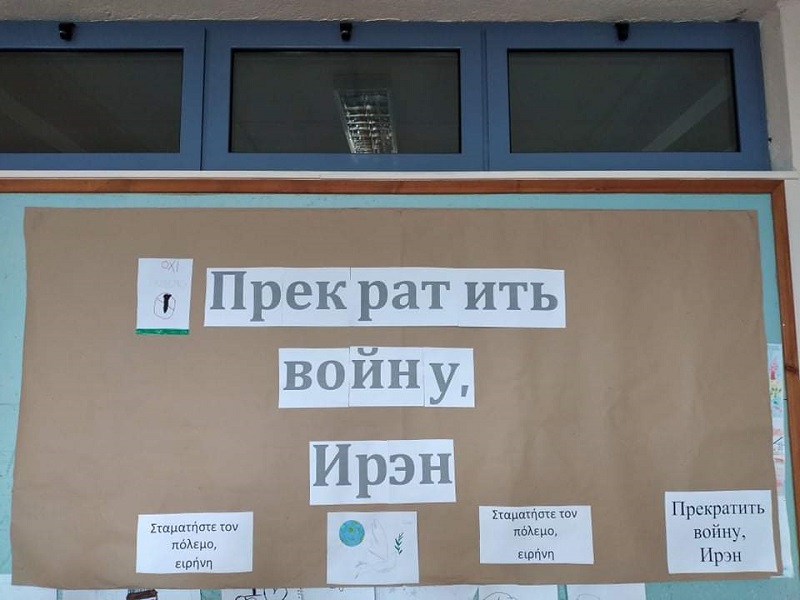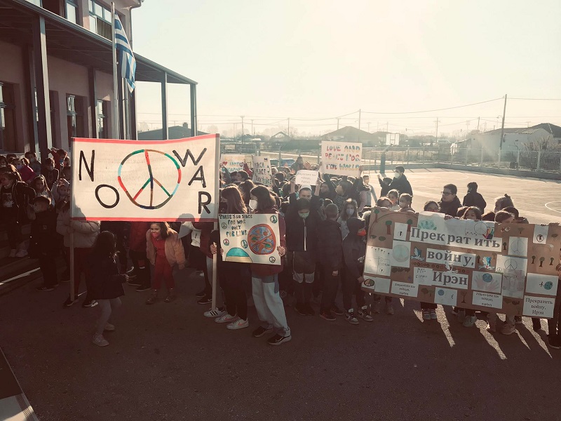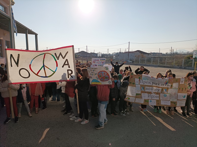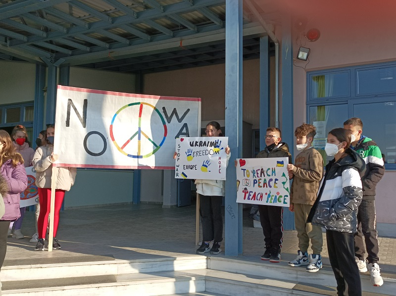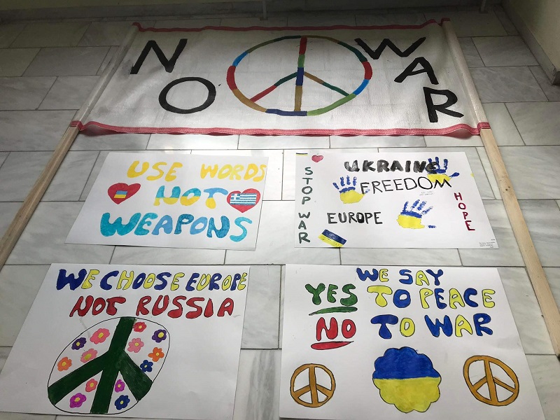 Ξένων Γλωσσών του σχολείου μας, σε συνεργασία με την Εικαστικό και την εκπ/κό Μουσικής, οργάνωσαν και παρουσίασαν στο σχολείο γνωστά αγγλόφωνα αντιπολεμικά τραγούδια από τη δεκαετία του ’70 και σχετικές εικαστικές δημιουργίες με συνθήματα και πανό. Η όλη δράση διαχύθηκε αστραπιαία στη σχολική μας κοινότητα, εμπλουτίστηκε με επιπλέον δραστηριότητες και έτσι το πρωί της Πέμπτης 3/03/2022 όλα τα μέλη, εκπαιδευτικοί και παιδιά συμμετείχαν σε μία αντιπολεμική διαδήλωση στον Προαύλιο χώρο του Σχολείου. Το eTwinning, η μεγαλύτερη κοινότητα των σχολείων της Ευρώπης, αποδεικνύει για ακόμη μια φορά τη συνεργατική της υπόσταση και υποστήριξη στο λαό που πλήττεται από τον φρικαλέο αυτόν πόλεμο. Ας γεμίσουν οι φωνές των παιδιών μας ελπίδα για άμεση κατάπαυση των βομβαρδισμών.